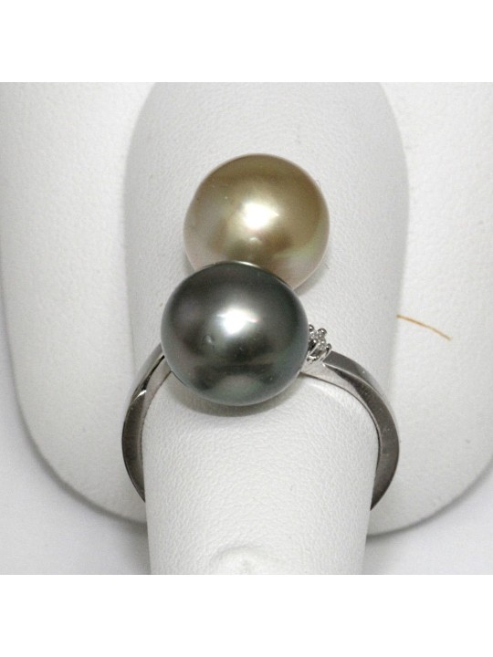 Découvrez l'attrait des mers du Sud avec cette bague en perles. Présentant un duo captivant de perles de culture une jaune dorée australienne éclatante et une noire tahitienne mystérieuse ce design Leilani incarne l'élégance intemporelle. Chaque perle de 9-10mm, de qualité AAA, est complétée par des diamants scintillants, montés dans votre choix de or blanc ou jaune 18k ou 14k.