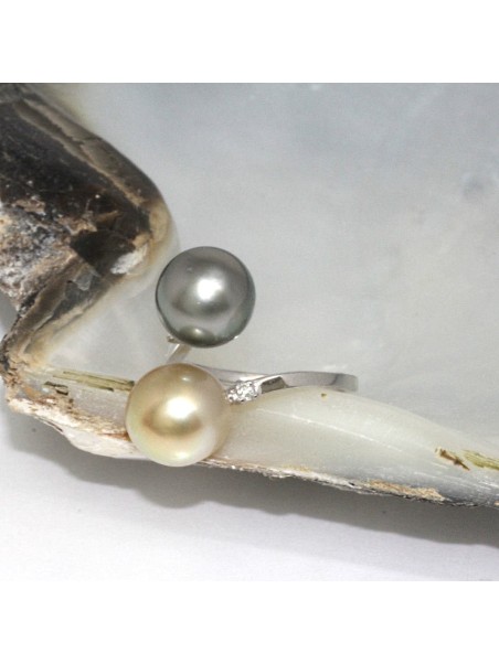 Elle mélange à la perfection une perle tahiti noire luisante et une perle d’Australie dorée à souhait. C'est le bijou du siècle, peut-on dire sans exagérer, puisque la beauté simple et élégante de cette bague est à couper le souffle. Les perles sont de qualité AAA et respecte la traditionnelle dimension de 9 à 10 mm. C'est une bague à adopter et à préférer dans son écrin à bijoux. La bague léilani est simplement la bague de vos rêves qui vient à vous dans toute sa splendeur et toute sa forme de séduction.