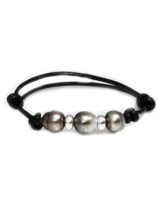 Bracelet en cuir noir réglable avec 3 perles de Tahiti baroques