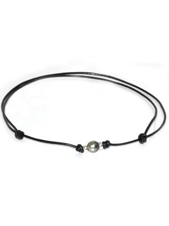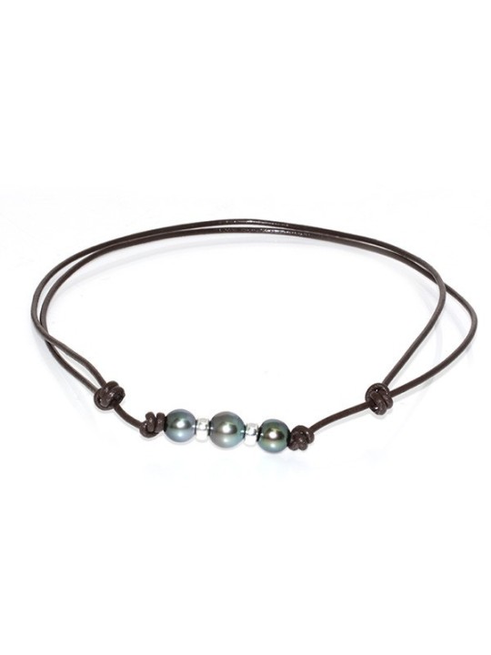 Découvrez ce magnifique collier en cuir marron orné de trois perles de Tahiti de qualité AAA, aux reflets subtils verts et gris. Les perles rondes et lisses, d'un diamètre de 9 à 10 mm, sont mises en valeur par un ornement en argent finement placé entre les deux premières perles, ajoutant une touche d'élégance à l'ensemble. Le collier est réalisé à partir de deux cordons en cuir marron, noués aux extrémités pour former un motif distinctif et permettant un ajustement facile grâce à son système de noeud coulissant. La longueur du collier est adaptable à votre convenance, s'adaptant ainsi parfaitement aux tours de cou d'adulte ou d'enfant. Ce bijou simple mais raffiné est issu de notre collection Cuir, alliant avec brio sobriété et sophistication. Il se distingue par sa capacité à s'adapter à diverses occasions, qu'il s'agisse d'une sortie décontractée ou d'une soirée plus habillée.