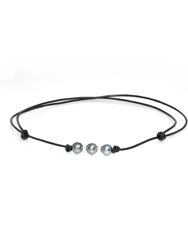Ce collier ras du cou élégant présente trois grandes perles tahitiennes rondes et baroques, mesurant 9-10 mm, enfilées sur une fine sangle en cuir noir avec des nœuds coulissants. Les perles sont séparées par des entretoises transparentes discrètes. Convient aussi bien aux adultes qu'aux enfants, cet accessoire polyvalent est parfait pour s'habiller ou ajouter une touche d'élégance à une tenue quotidienne. Fabriqué avec des perles tahitiennes AA de haute qualité, ce collier ras du cou dégage sophistication et style moderne. La longueur ajustable garantit un ajustement confortable pour différentes tailles de cou. Un ajout chic à toute tenue avec son design sobre mais raffiné.