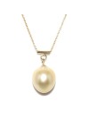 Vous pouvez commander le pendentif or avec une chaîne en maille forçat de 1 mm incluse. La perle dorée qui provient des mers du sud d’Australie a un diamètre de 9-10 mm et une forme ovale.