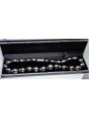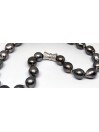 Ce collier en perles de Tahiti présente un rang de 38/42 perles baroques d'une qualité exceptionnelle, sélectionnées pour leur beauté et leur lustre. Chaque perle, d'un diamètre compris entre 12 et 15 mm, affiche une couleur riche et sombre avec des nuances de gris foncé, créant un effet ombré subtil qui ajoute à son charme.