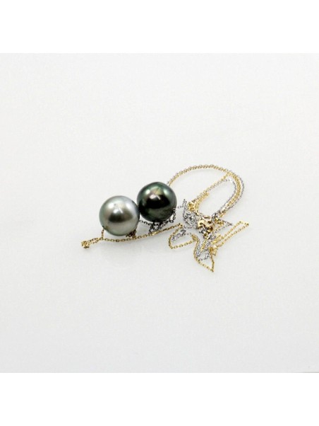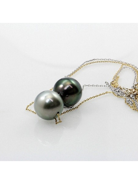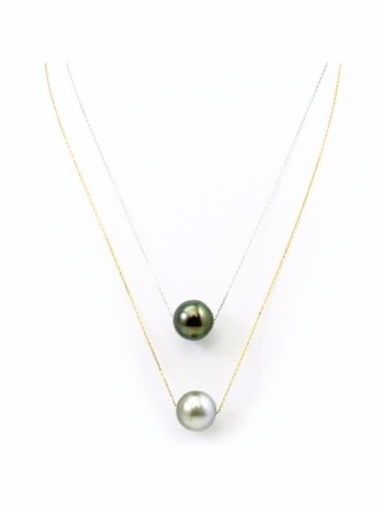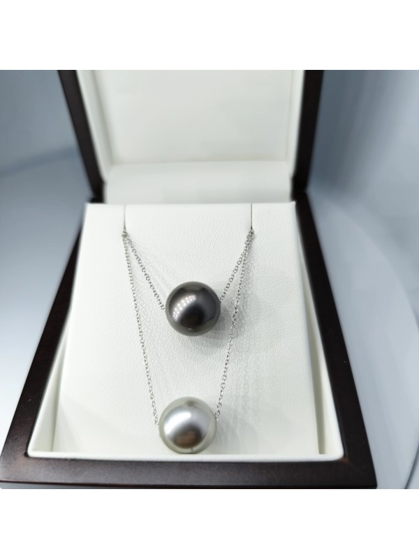Ce magnifique double collier est doté de deux perles de Tahiti de forme ronde et d’un diamètre de 12-13 mm. Ce collier en or 14 carats comprend une chaîne en maille forçat robuste et de grande qualité. Nous vous contacterons directement pour faire le choix avec vous des perles pour une création sur mesure. Les sublimes perles naturelles sont de qualité AAA, leur lustre illuminera votre buste avec élégance durant de longues années !