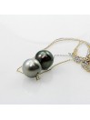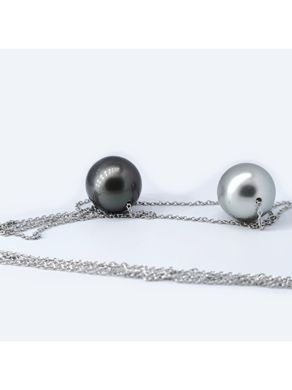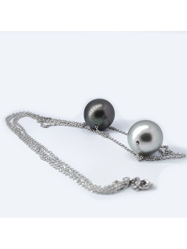 Ce collier double de perles élégant présente deux perles de Tahiti rondes de haute qualité avec une note AAA et un diamètre de 12-13 mm. Les perles sont montées sur une chaîne en or luxueuse avec un maillon forçat, terminé par un fermoir en anneau marin robuste. Le collier met en valeur la beauté naturelle des perles noires, en faisant un accessoire sophistiqué pour toute occasion, parfait pour ceux qui apprécient les bijoux fins et l'élégance des perles de Tahiti de la collection Luxe.