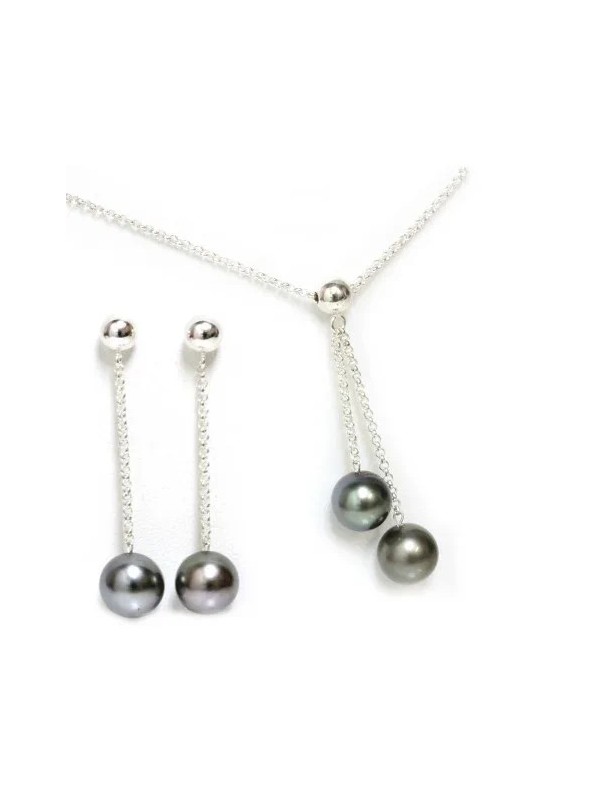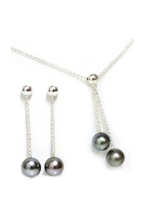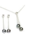 Ce magnifique collier pour femme est composé d'une chaîne robuste de 42 cm de longueur en argent pur qui maintient un pendentif argenté, ce dernier est doté de deux perles rondes. La paire de boucles d’oreilles est également fabriquée en argent et comprend des perles AAA de la même couleur.