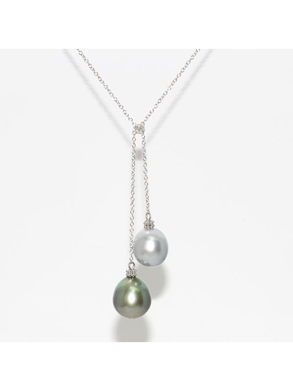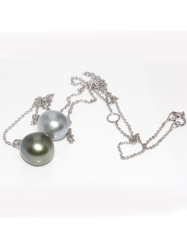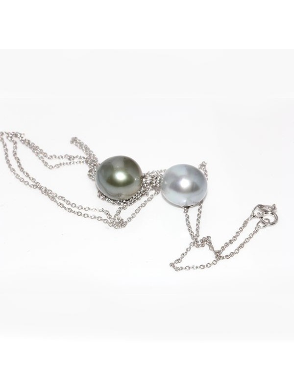 Ce collier exquis présente deux perles de Tahiti d'une qualité exceptionnelle, classées AAA, affichant une forme ovale parfaite et une finition brillante. Les perles sont soigneusement sélectionnées pour se compléter, l'une affichant une teinte grise et gris clair profonde et riche, tandis que l'autre présente un ton subtil et nuancé. La collection Luxe est réputée pour son attention aux détails et son engagement envers l'excellence.