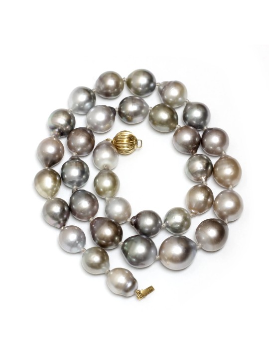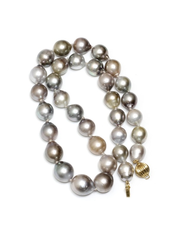 Ce bijou rang de perles pour femme comprend entre 40 et 44 perles de Tahiti baroques de couleurs pastels différentes ! Ces perles de culture ont une forme ronde et sont de qualité AAA, elles mesurent 10-13 mm de diamètre. Les gemmes naturelles de Tahiti sont enfilées sur un fil de soie, possibilité de choisir le type du fermoir en or.