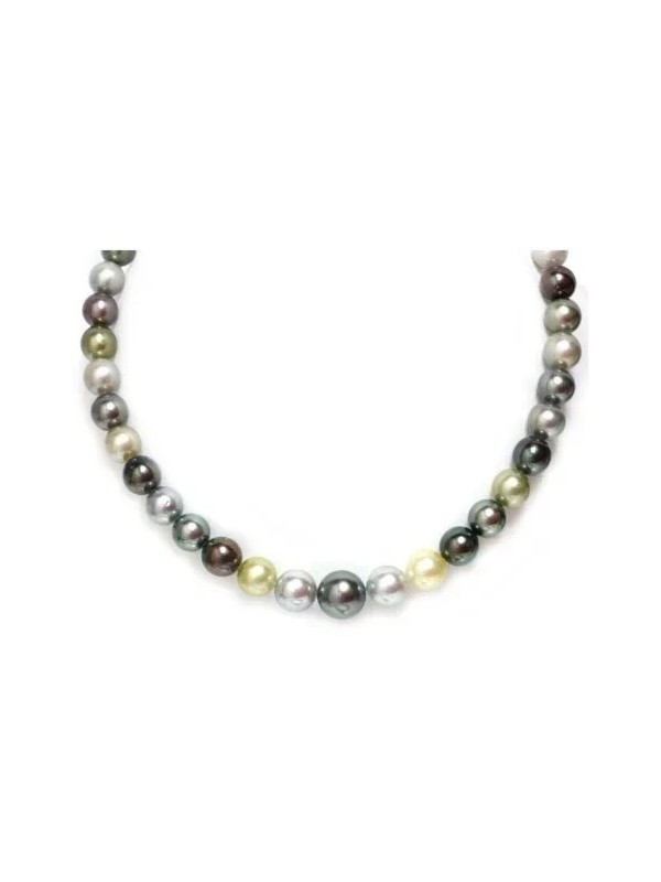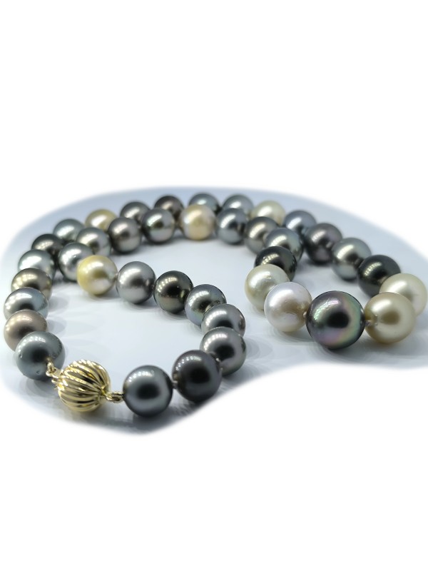 Une palette de nuances fascinantes du blanc lumineux et du gris subtil au brun foncé riche crée un look véritablement unique et sophistiqué. Chaque perle ronde parfaitement formée est soigneusement enfilée sur un cordon délicat, culminant en un design élégant sécurisé par un fermoir boule classique. Découvrez l'élégance intemporelle des véritables Perles de Tahiti.
