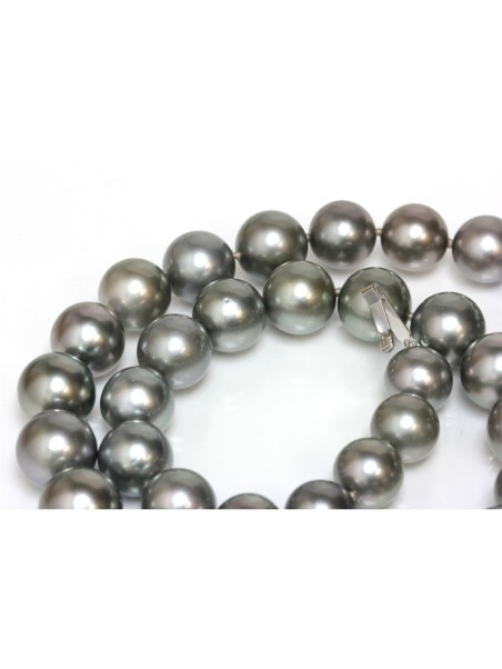 La couleur des perles est caractérisée par une palette subtile et nuancée, avec des teintes majoritairement gris argenté. Le collier est composé d'environ 40-43 perles, enfilées sur un fil solide et flexible, se terminant par une attache en forme de boule en or 14 carats.