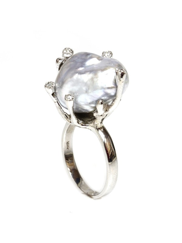 La perle fait 15mm et à une forme un peu irrégulière qui lui donne tout son charme. Elle est accompagnée de six diamants qui l'entourent comme un menhir, des pierres qui font 0.15 carats. Tout cet ensemble donne à la bague Naoa son charme particulier et exceptionnel. C'est une bague confectionnée pour la femme de pouvoir que vous êtes. Elle est imposante et affiche votre puissance et votre capacité à dominer les situations.