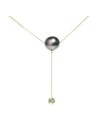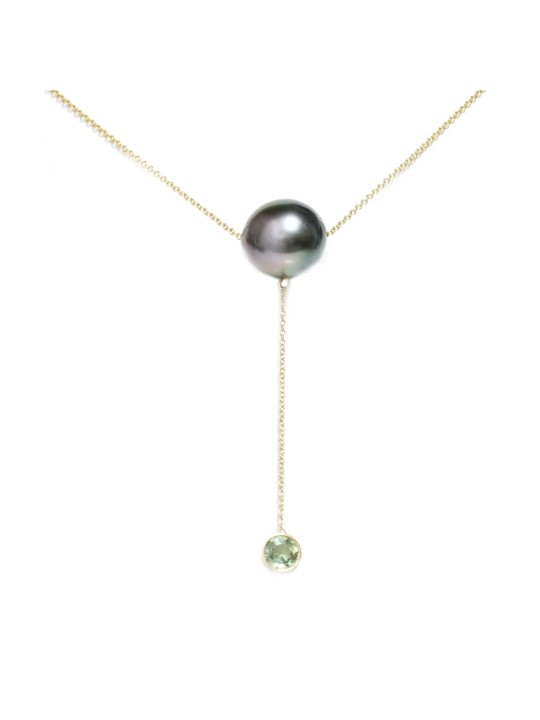 Ce pendentif élégant présente une perle tahitienne lustrée coulissante sur une chaîne en or, complété par un saphir vert pâle qui ajoute une touche de sophistication. La perle tahitienne ronde, avec ses subtils reflets gris et violets, est le point focal de ce design raffiné. Posé sur une chaîne simple, ce pendentif dégage un luxe discret, le rendant parfait pour des occasions formelles ou un usage quotidien. La combinaison de la beauté naturelle de la perle tahitienne et de l'élégance du saphir crée une pièce de bijouterie véritablement unique qui incarne l'essence du raffinement et de l'élégance polynésienne.