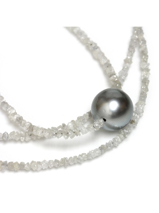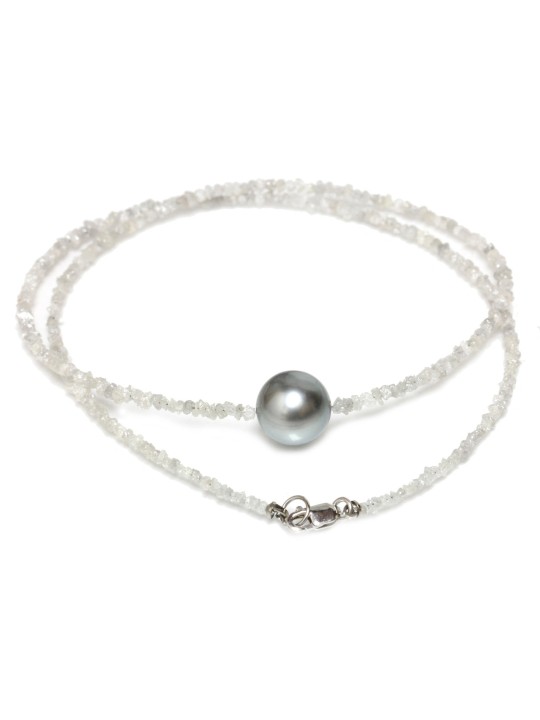 Découvrez l'attrait des mers de Polynésie avec ce Collier perle de Tahiti et diamants bruts exquis. Une captivante Perle de Tahiti de 10-11 mm, réputée pour sa profonde couleur grise et sa qualité AAA, est mise en avant. Cette pièce luxueuse de notre Collection Luxe est délicatement ornée de diamants bruts et scintillants, créant un contraste harmonieux de textures et de lumière.
