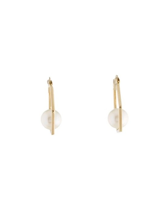 Les montures sont réalisées en or jaune 14 carats, offrant un contraste élégant avec la blancheur immaculée des perles. Chaque boucle d'oreille est soigneusement montée sur une armature dorée lisse et raffinée, sans texture ni motif superflu, mettant ainsi en valeur la pureté et la simplicité de la perle.