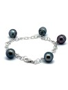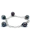 Bracelet Breloques est une magnifique chaîne en argent ornée de cinq perles noires brillantes de tailles variées, disposées dans un motif alterné. La plus petite perle occupe le devant de la scène, flanquée de deux de chaque côté, tandis qu'une perle plus grande ancre l'extrémité. Fabriqué en métal argent 925 rhodié épais, ce bijou élégant dégage une sophistication. Le subtil jeu d'ombres sur le fond blanc uni met en valeur les détails complexes de la chaîne et des perles tahitiennes. Parfait pour s'habiller ou ajouter une touche d'élégance à une tenue quotidienne, ce bracelet en perles est un accessoire intemporel qui incarne le luxe discret et le raffinement.