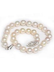 Bracelet Perles d'Australie mers du Sud 10-11.5 mm rondes top qualité AAA couleur dorée champagne et perles Akoya du Japon 7.5-8mm blanche de qualité AAA. Le bracelet est noué double avec de la soie et serti avec un fermoir en or jaune 14 carats ou 18 carats. Des rondelles en or et diamants...