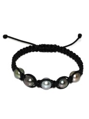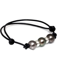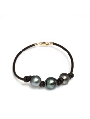 Bracelet en cuir noir réglable avec 3 perles de Tahiti baroques