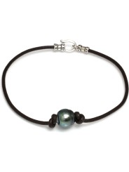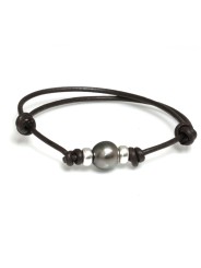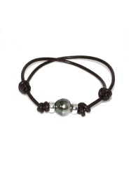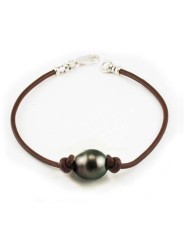Bracelet en cuir marron réglable avec 1 perle de Tahiti ronde