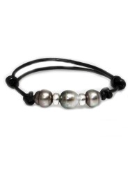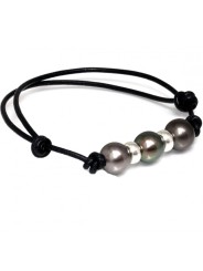 Bracelet en cuir noir avec 3 perles de Tahiti baroques avec fermoir argent ou or au choix.
