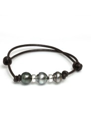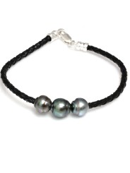 Bracelet en cuir tréssé avec 3 perles de Tahiti baroques.