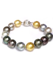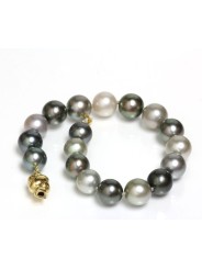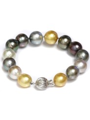 Bracelet Perles de Tahiti 10-11 mm rondes top qualité AAA multi couleurs naturelles aubergine, vert, pistache et argenté. Fermoir or jaune ou blanc 14K ou 18K de forme boule au choix. Le bracelet "Mae" est un bijou exceptionnel qui allie l'élégance intemporelle des perles de Tahiti à un design...