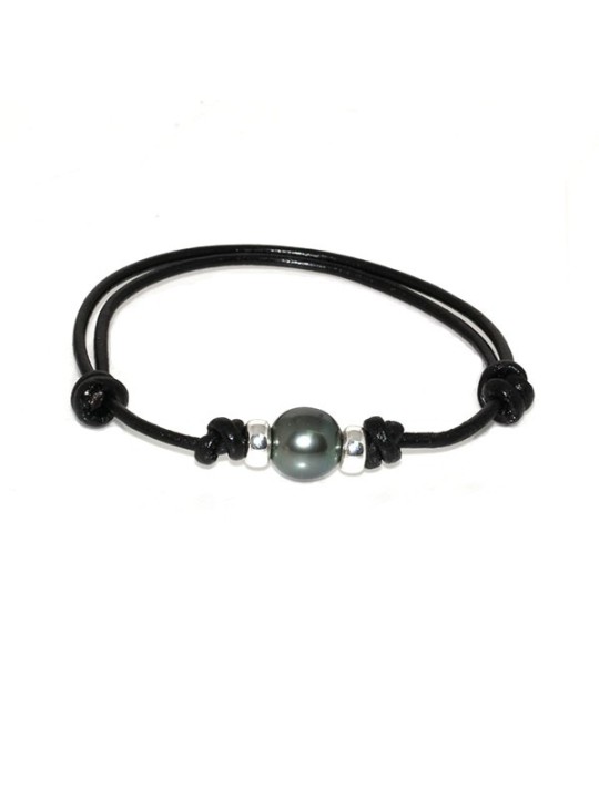 Ce bracelet est un bijou élégant et raffiné qui met en valeur la beauté des perles noires de Tahiti. Il est composé d’un cordon en cuir noir tressé et de trois perles de culture de Tahiti rondes et lustrées. Les perles ont des reflets verts, bleus et violets qui varient selon la lumière. Le bracelet se compose de rondelles en argent 925 rhodié.